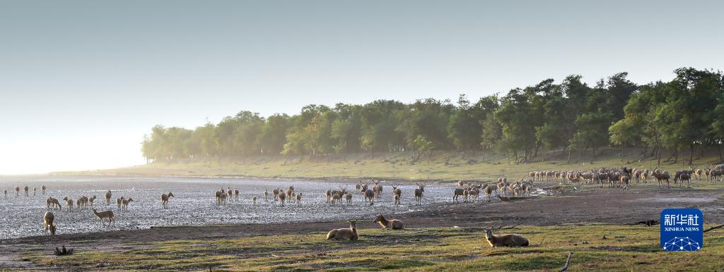 大豐麋鹿國家級自然保護區野外生活的麋鹿種群( 8月21日攝)。