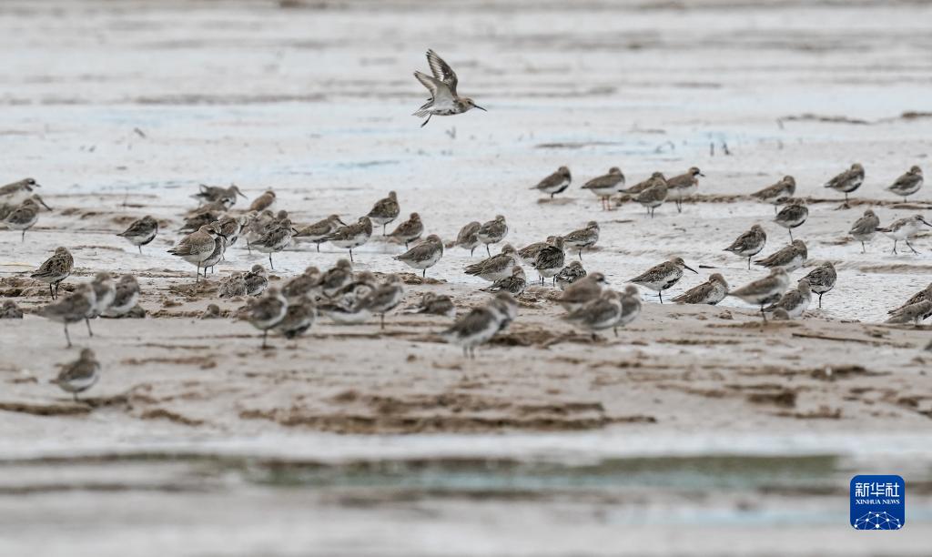 一群鳥(niǎo)棲息在東臺條子泥濕地的灘涂上(8月31日攝)。