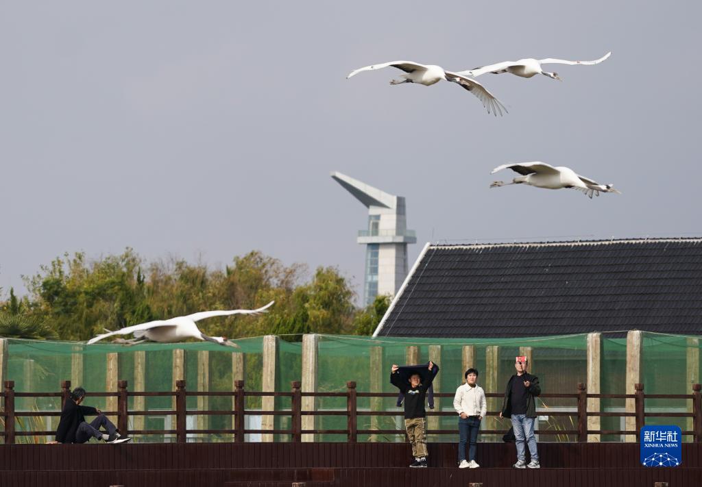 在江蘇鹽城濕地珍禽國家級自然保護區,游客觀(guān)看人工繁育的丹頂鶴練習飛翔(2022年11月8日攝)。