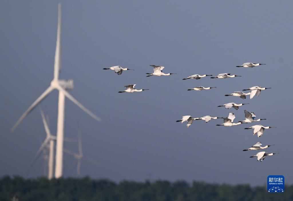 黑臉琵鷺在鹽城東臺條子泥濕地上空飛翔(9月1日攝)。