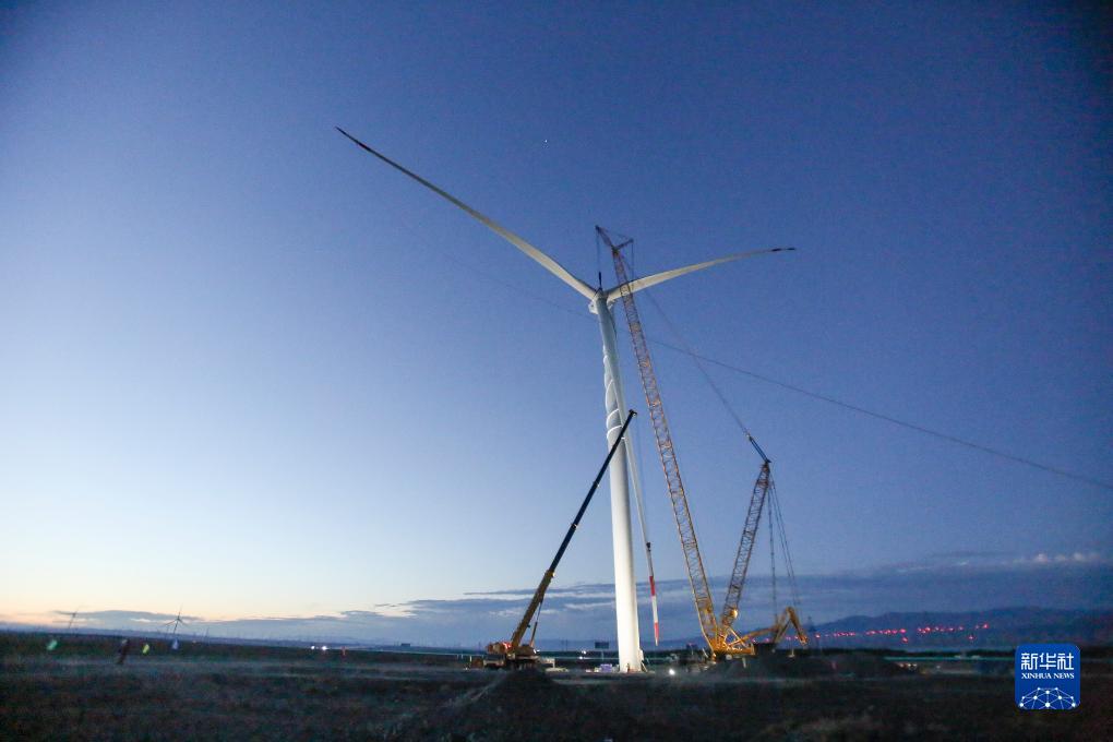 在新疆達坂城風(fēng)電場(chǎng)拍攝的一臺風(fēng)力發(fā)電機組吊裝作業(yè)現場(chǎng)(8月4日攝)。