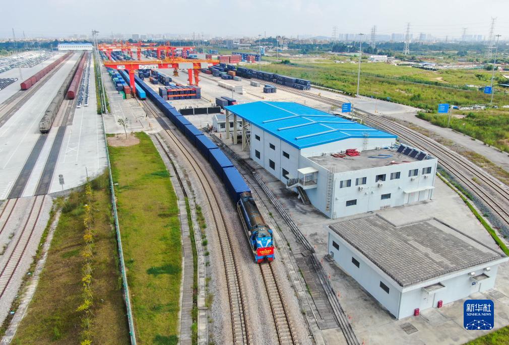 9月20日,50英尺集裝箱多聯(lián)快車(chē)X802次貨運列車(chē)從廣州國際港駛出,一路北上向著(zhù)長(cháng)沙而行(無(wú)人機照片)。