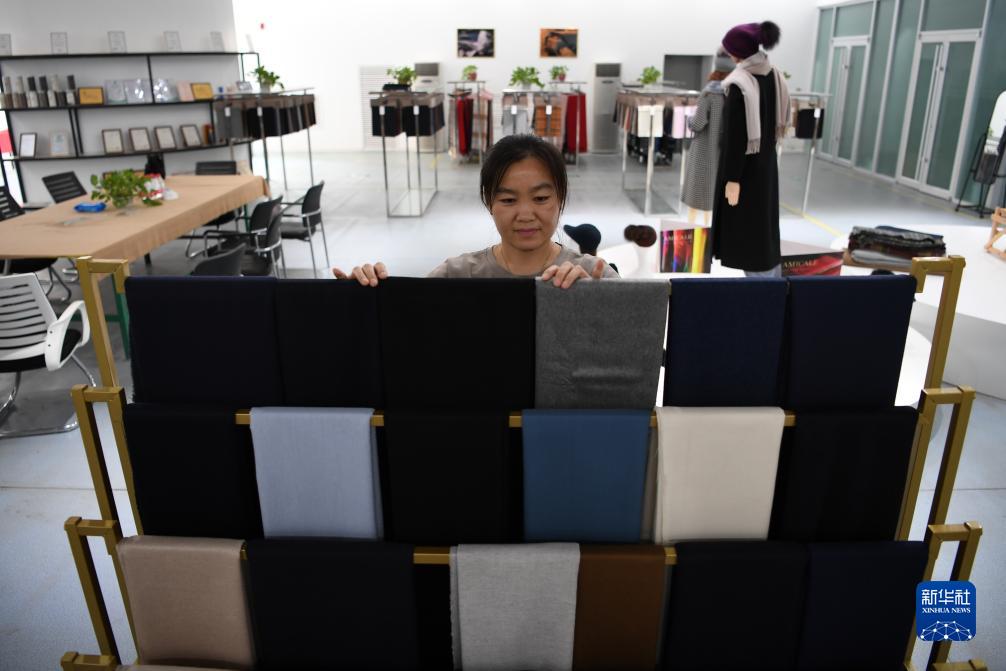9月20日,安美橋(南宮)羊絨制品有限公司的工作人員在展廳內整理羊絨圍巾。