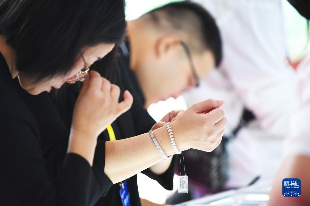 9月20日,觀(guān)眾在鄭州國際會(huì )展中心試戴鉆石首飾。