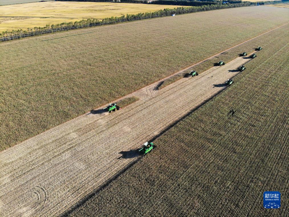 這是9月20日在位于雙鴨山市友誼縣的北大荒農業(yè)股份有限公司友誼分公司一地塊拍攝的秋收現場(chǎng)(無(wú)人機照片)。