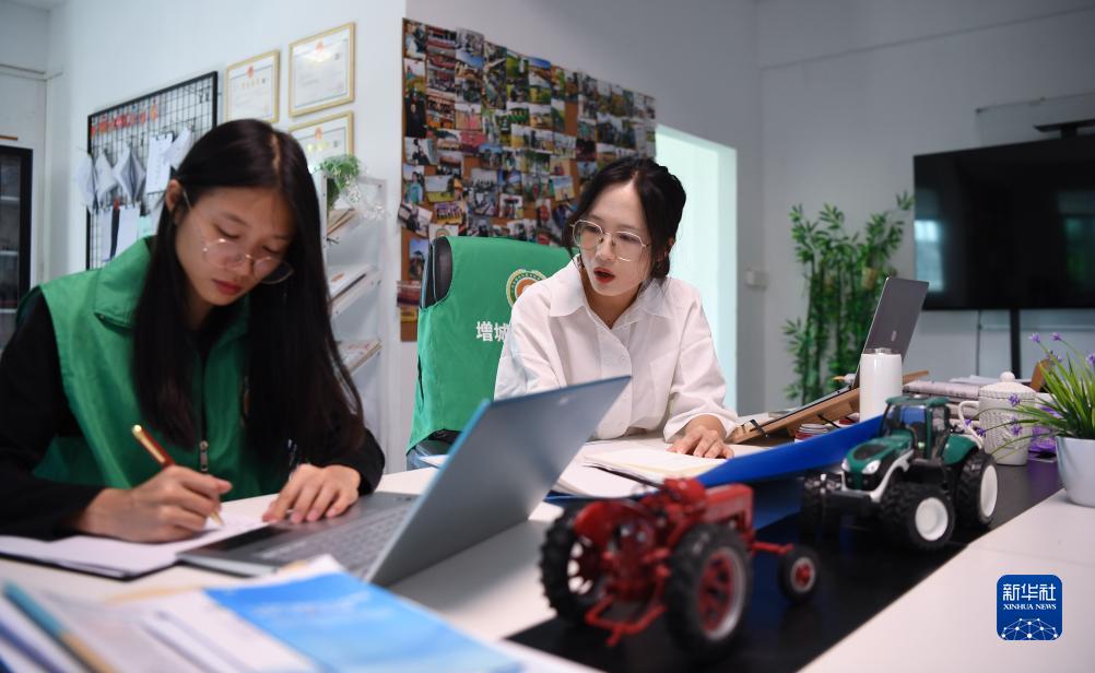9月18日,在廣州市增城區石灘鎮石湖村的石鄉農機專(zhuān)業(yè)合作社,沈燕芬(右)和沈笑芬在商量工作規劃。