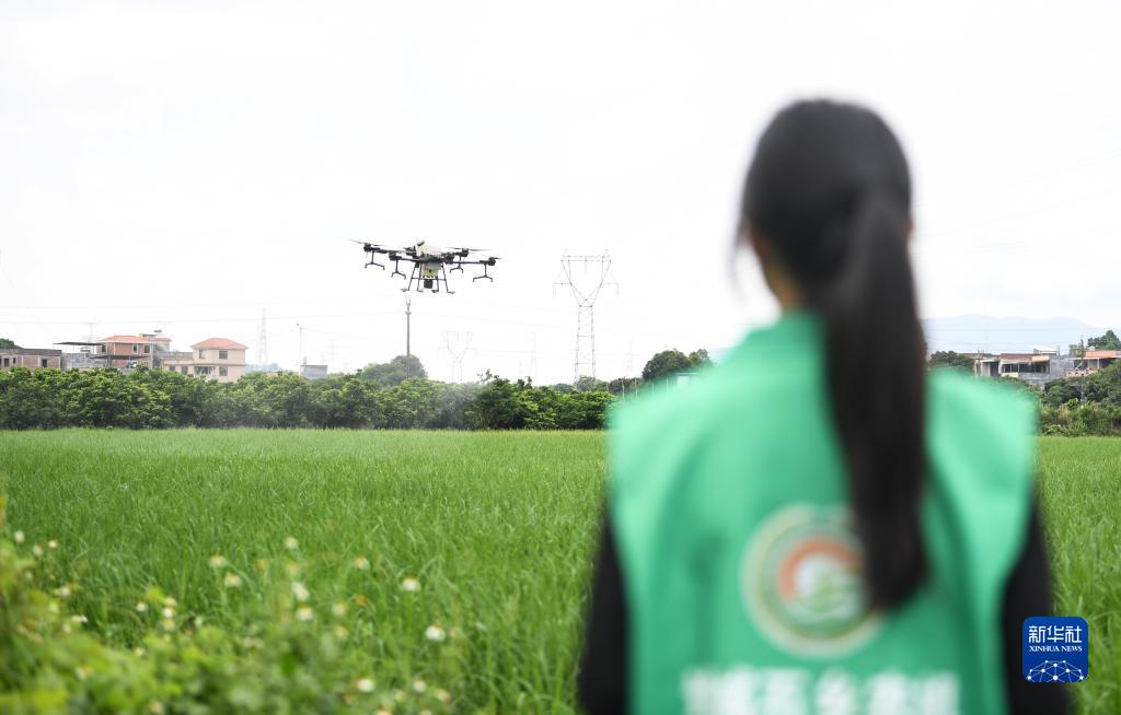9月13日,在廣州市增城區石灘鎮石湖村,沈笑芬操作農用無(wú)人機噴灑農藥。