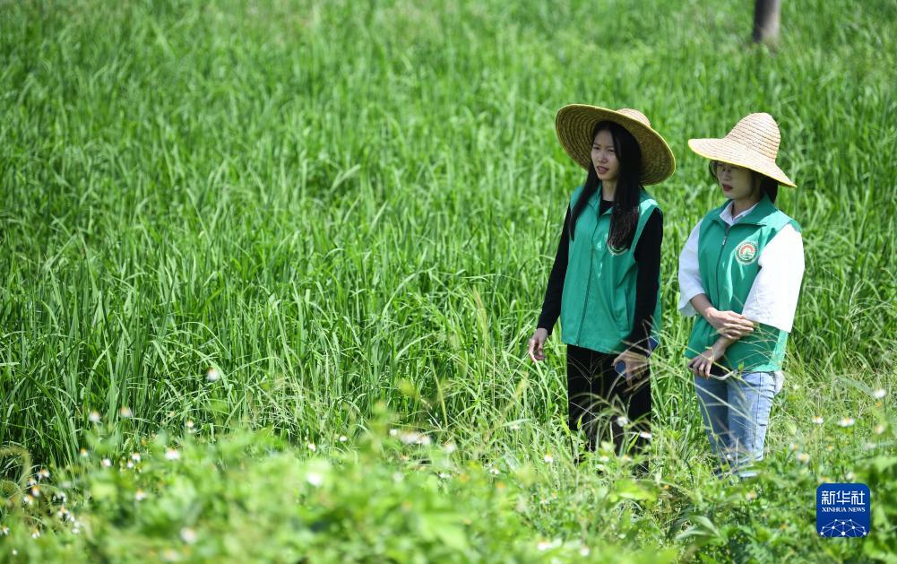 9月18日,在廣州市增城區石灘鎮石湖村一處農田,沈燕芬(右)和沈笑芬查看禾苗長(cháng)勢。