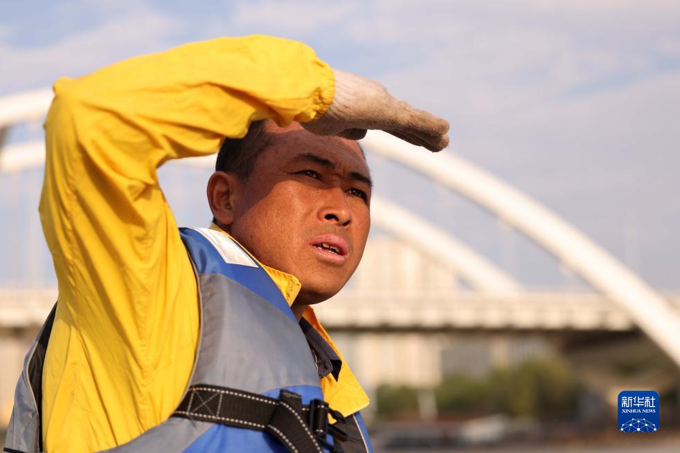 牛強帶著(zhù)游客在黃河甘肅蘭州段體驗羊皮筏子(9月5日攝)。