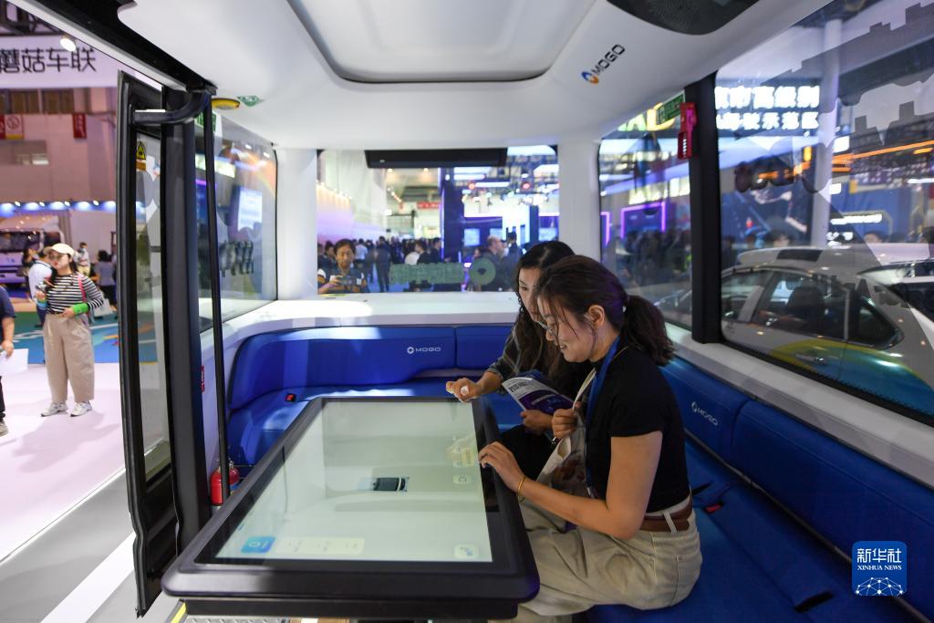 9月21日,在2023世界智能網(wǎng)聯(lián)汽車(chē)大會(huì )室內展區,參觀(guān)者在一輛無(wú)人駕駛小巴車(chē)內體驗。