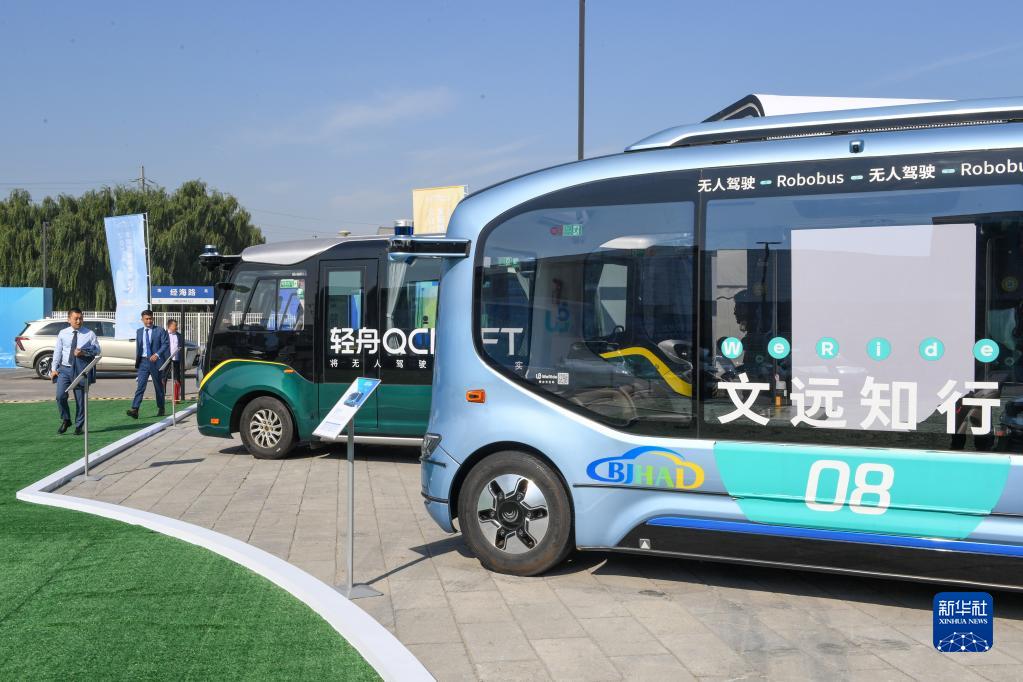 9月21日,在2023世界智能網(wǎng)聯(lián)汽車(chē)大會(huì )室外展區,參觀(guān)者參觀(guān)展出的無(wú)人駕駛小巴車(chē)。