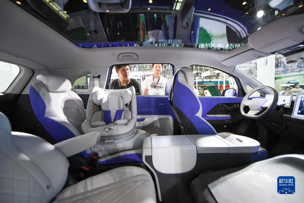 9月21日,在2023世界智能網(wǎng)聯(lián)汽車(chē)大會(huì )室內展區,幾位參觀(guān)者在參觀(guān)一輛新能源汽車(chē)。