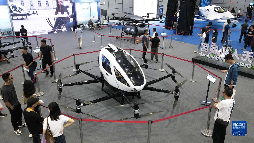這是2023世界制造業(yè)大會(huì )上展出的載人級自動(dòng)駕駛飛行器(9月21日攝,無(wú)人機照片)。