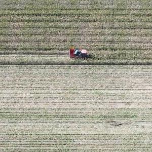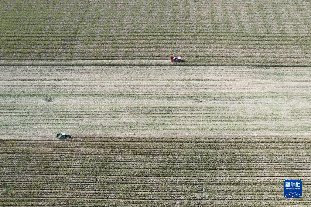 9月21日,在張掖市甘州區沙井鎮五個(gè)墩村,玉米收獲機在啟動(dòng)儀式現場(chǎng)收割制種玉米(無(wú)人機照片)。