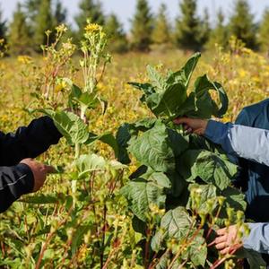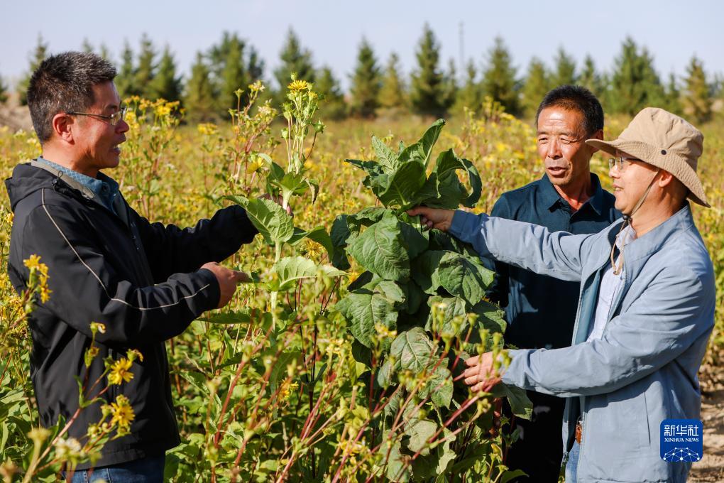 來(lái)自福建省南平市光澤縣農業(yè)農村局的援疆干部呂軍(左)、來(lái)自福建省武夷山市經(jīng)濟作物技術(shù)站的援疆干部黃文慶(右)與新疆木壘生福生態(tài)農業(yè)發(fā)展有限公司負責人閆生福交流試種的大葉蛋白菊生長(cháng)情況(9月20日攝)。