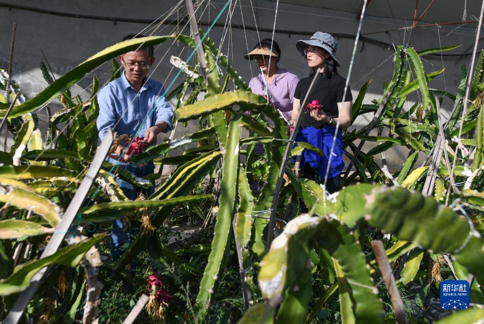 來(lái)自福建省漳州市農業(yè)農村局的黃素英(右)和來(lái)自福建省武夷山市經(jīng)濟作物技術(shù)站的援疆干部黃文慶(左)與木壘縣博泰農業(yè)科技開(kāi)發(fā)有限責任公司負責人朱娜(中)交流試種的火龍果生長(cháng)情況(9月20日攝)。