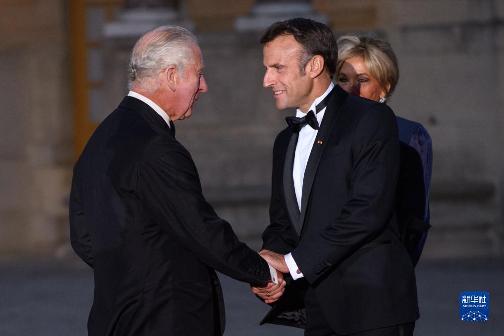 9月20日,在法國巴黎近郊的凡爾賽宮,法國總統馬克龍(中)迎接前來(lái)出席國宴的英國國王查爾斯三世(左一)。