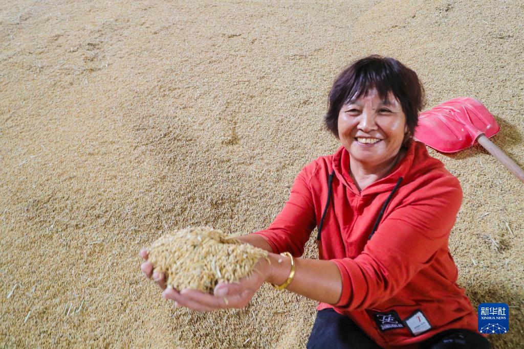 9月21日,在河南省信陽(yáng)市光山縣羅陳鄉張樓村,合作社社員在一處機械化水稻烘干中心展示稻谷。