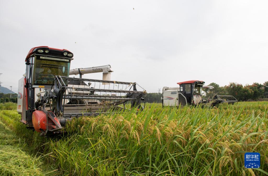 9月21日,在浙江省金華市金東區澧浦鎮東湖畈標準農田提升區塊,收割機搶收成熟的單季稻。