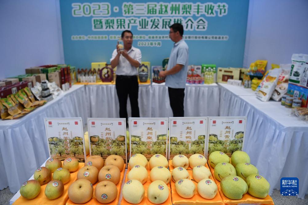 9月22日,客商在趙縣舉辦的梨果產(chǎn)業(yè)發(fā)展推介會(huì )上介紹梨果深加工產(chǎn)品。新華社記者 牟宇 攝