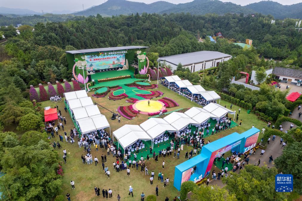 這是9月22日在湘潭盤(pán)龍大觀(guān)園拍攝的第二屆湖南花卉苗木博覽會(huì )開(kāi)幕式現場(chǎng)(無(wú)人機照片)。