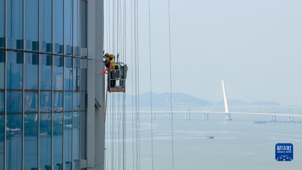 在中國電子集團深圳灣總部基地建設現場(chǎng),工人在吊籃上進(jìn)行外立面裝飾條安裝作業(yè)(無(wú)人機照片,9月22日攝)。
