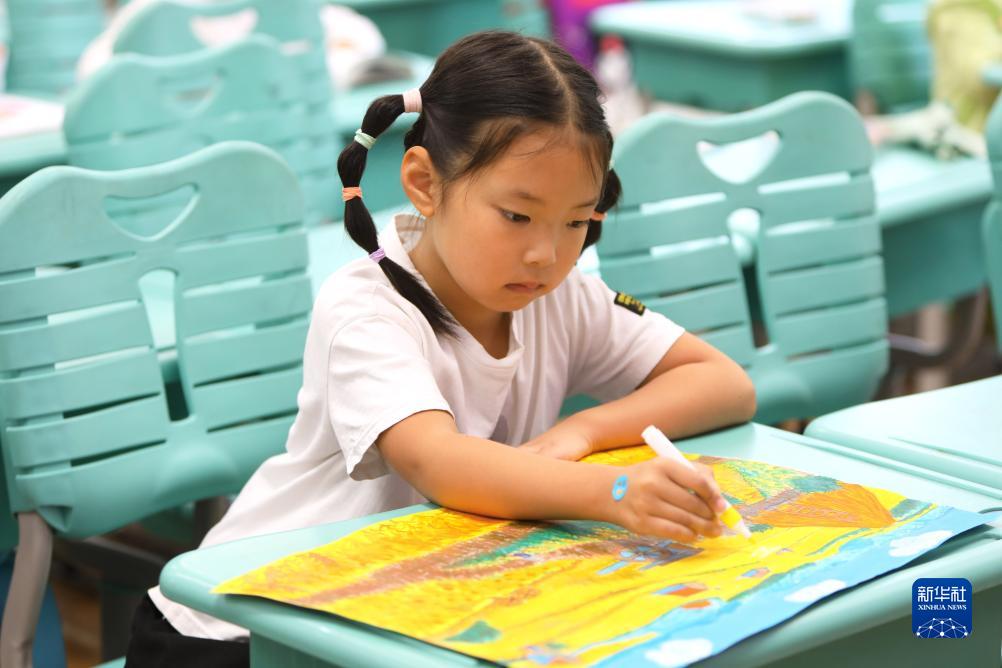 9月22日,一名小朋友在創(chuàng )作以豐收節為主題的繪畫(huà)作品。