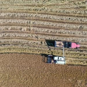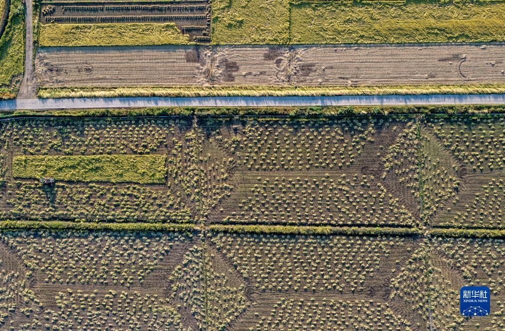 9月21日,在吉林省舒蘭市平安鎮金星村,農民駕駛農機收割水稻(無(wú)人機照片)。