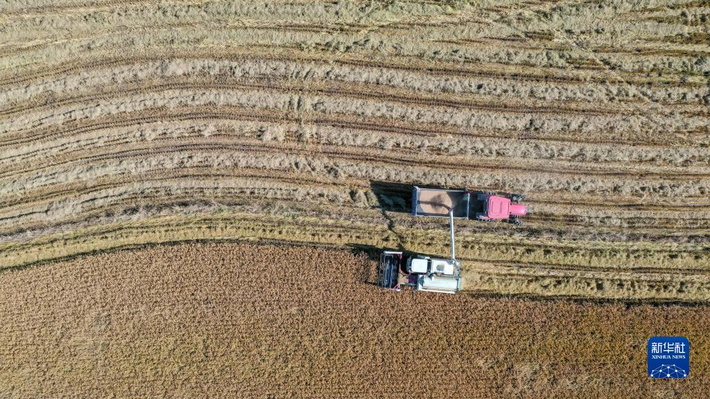 9月22日,在吉林省長(cháng)春市九臺區龍嘉農樂(lè )種植家庭農場(chǎng),農民駕駛農機收割水稻(無(wú)人機照片)。