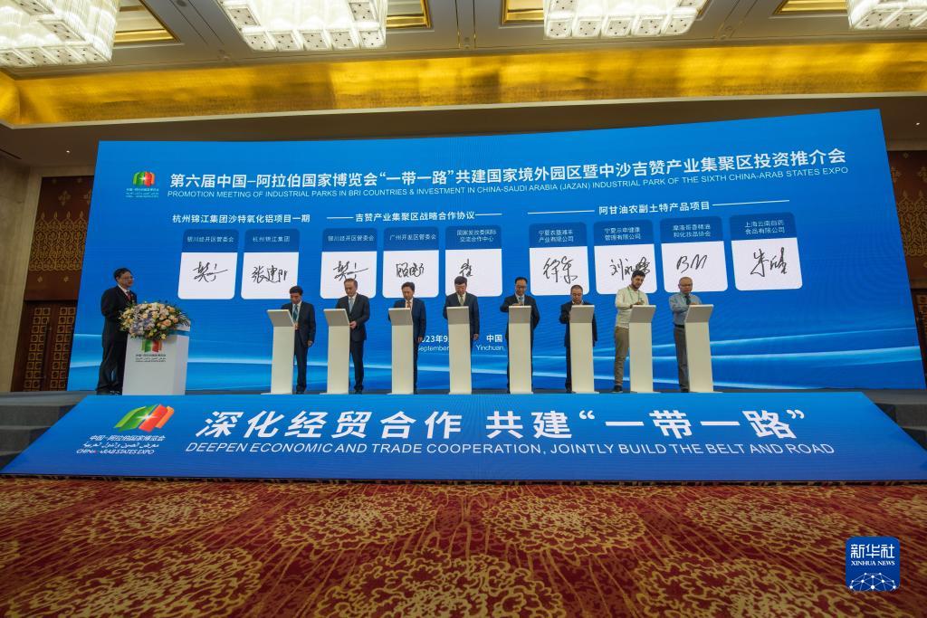 這是9月22日在銀川拍攝的第六屆中阿博覽會(huì )“一帶一路”共建國家境外園區暨中沙吉贊產(chǎn)業(yè)集聚區投資推介會(huì )簽約儀式現場(chǎng)。