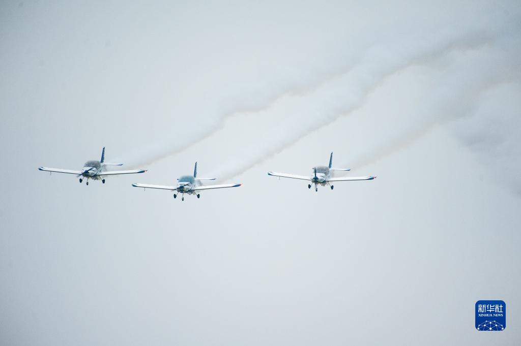 9月22日,在湖南株洲蘆淞機場(chǎng),飛行員進(jìn)行固定翼編隊飛行表演。