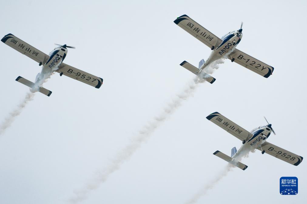 9月22日,在湖南株洲蘆淞機場(chǎng),飛行員進(jìn)行固定翼編隊飛行表演。