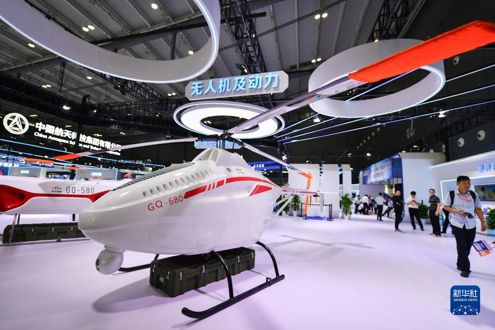9月22日,在湖南長(cháng)沙國際會(huì )展中心,參觀(guān)者在中國航天科工集團有限公司展位參觀(guān)無(wú)人直升機。