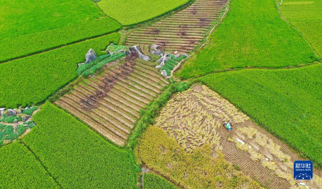 9月23日,湖南省永州市新田縣石羊鎮景仙寺村,村民在田間搶收水稻(無(wú)人機照片)。