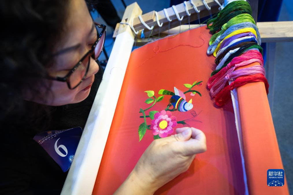 9月21日,選手陳紅平在現場(chǎng)展示利川刺繡技藝。