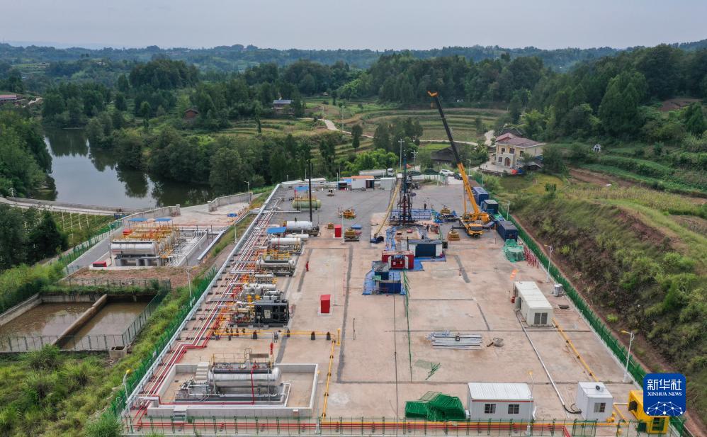 位于重慶忠縣的涪陵頁(yè)巖氣田興頁(yè)L1001井生產(chǎn)作業(yè)現場(chǎng)(9月19日攝,無(wú)人機照片)。