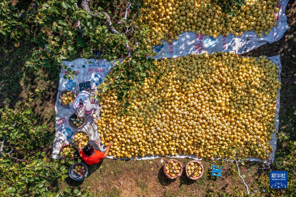 9月20日,安徽省宿州市碭山縣園藝場(chǎng)工人在分揀剛采摘的碭山酥梨(無(wú)人機照片)。