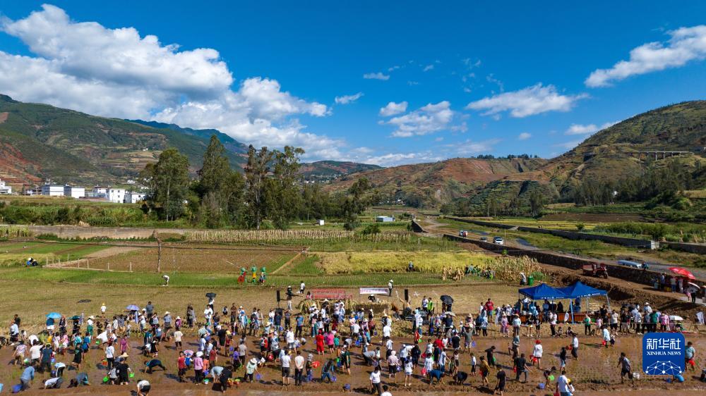 9月23日,在昆明市東川區烏龍鎮,農民參與豐收節活動(dòng)(無(wú)人機照片)。