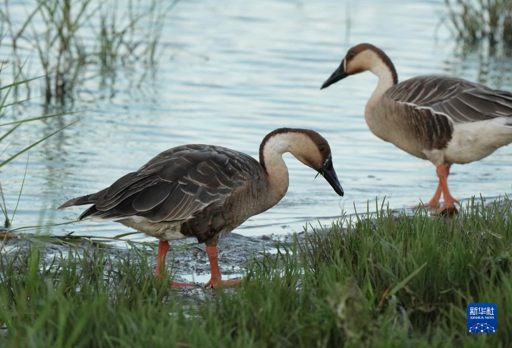 9月23日,兩只鴻雁在河北省秦皇島市北戴河區沿海濕地覓食。