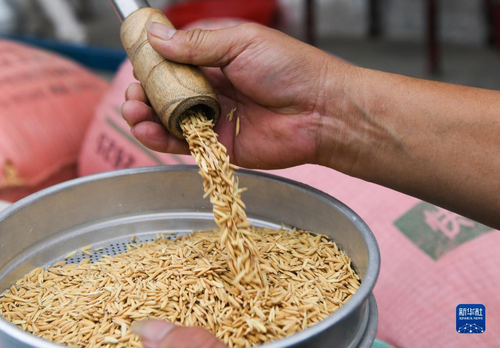 9月24日,在湖南省永州市道縣梅花鎮一家糧食收購企業(yè),工作人員在抽取稻谷檢測樣本。
