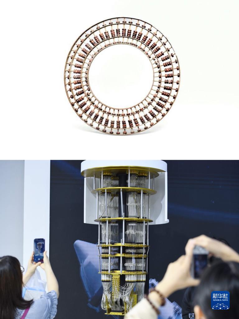 拼版照片:上圖為明代銅圓八卦算盤(pán)(安徽黃山程大位珠算博物館供圖);下圖為2023世界制造業(yè)大會(huì )上展出的“祖沖之號”超導量子計算機模型(9月21日攝,新華社記者周牧攝)。