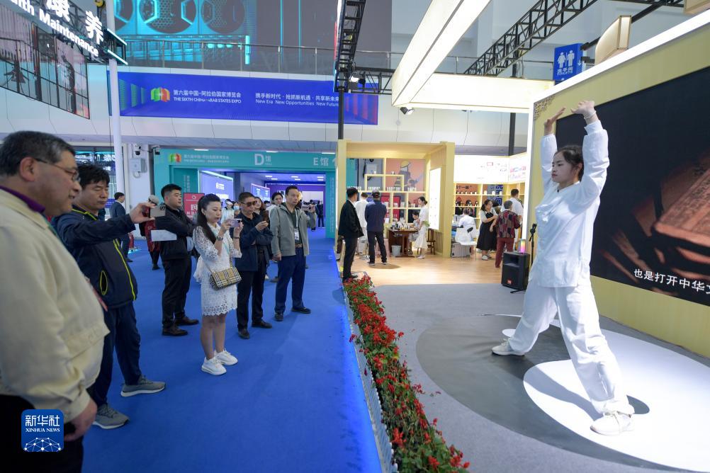 9月22日,觀(guān)眾在第六屆中國-阿拉伯國家博覽會(huì )醫療康養展區觀(guān)看健身功法。