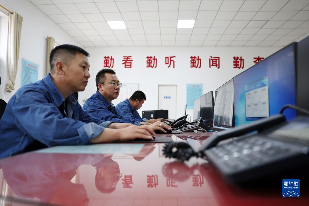 寧夏紅寺堡揚水管理處紅三泵站副站長(cháng)趙金柱(中)在中控室與同事監控各項數據(9月7日攝)。