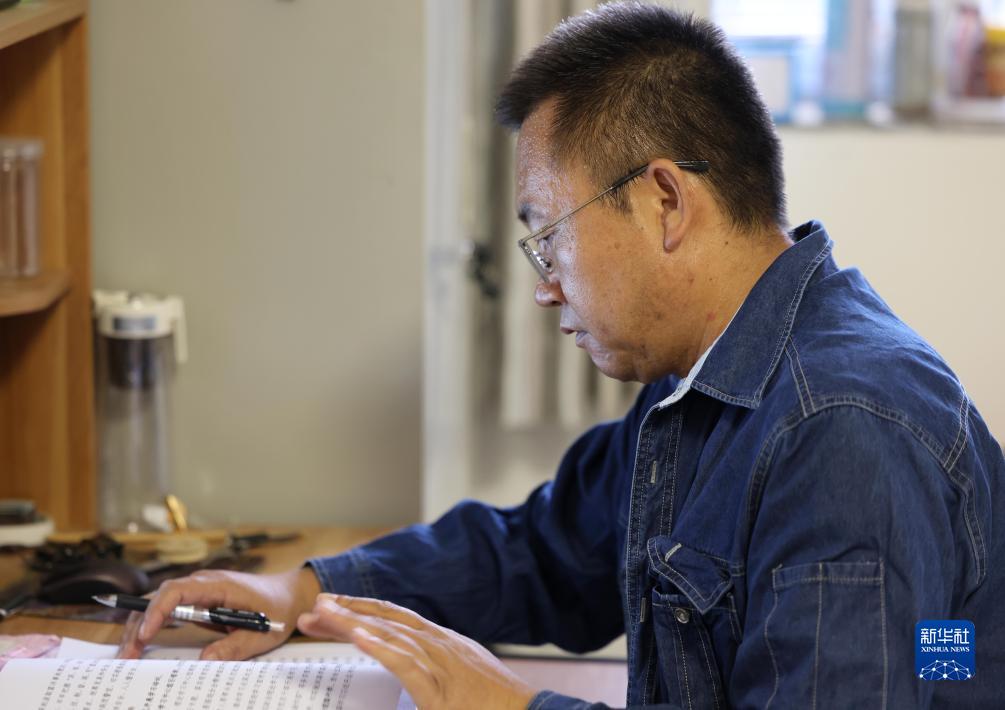 寧夏紅寺堡揚水管理處紅三泵站副站長(cháng)趙金柱在泵站宿舍整理材料(9月7日攝)。