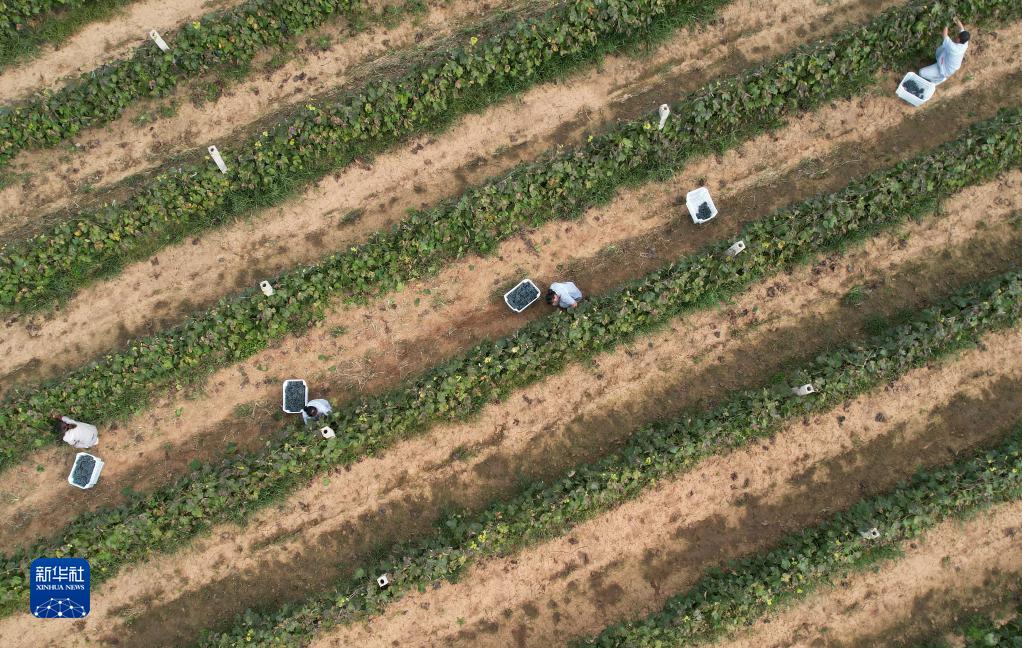 9月25日,河北省盧龍縣盧龍鎮一家葡萄酒企業(yè)的工人在釀酒葡萄種植基地采摘釀酒葡萄(無(wú)人機照片)。