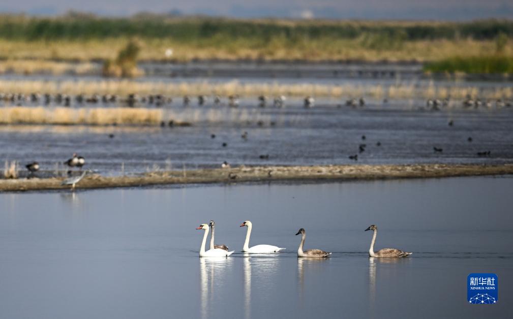 新時(shí)代中國調研行·黃河篇丨疣鼻天鵝在烏梁素海帶娃