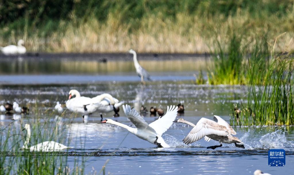 烏梁素海,意為“紅柳湖”,位于黃河“幾字彎”頂部,是黃河流域最大的湖泊濕地。近年來(lái),隨著(zhù)烏梁素海生態(tài)治理力度不斷加大,生態(tài)成果也不斷顯現。各類(lèi)候鳥(niǎo)在這里安了家,本來(lái)前往西伯利亞的疣鼻天鵝也在烏梁素海產(chǎn)卵孵化生活,烏梁素海成為我國最大的疣鼻天鵝繁殖基地。近日,在烏梁素海湖面上,成年疣鼻天鵝帶領(lǐng)幼鳥(niǎo)練習飛翔,準備為過(guò)冬前的長(cháng)途遷徙做準備。