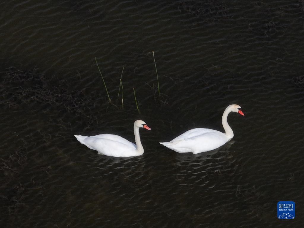 一對疣鼻天鵝在烏梁素海覓食(無(wú)人機照片,9月14日攝)。