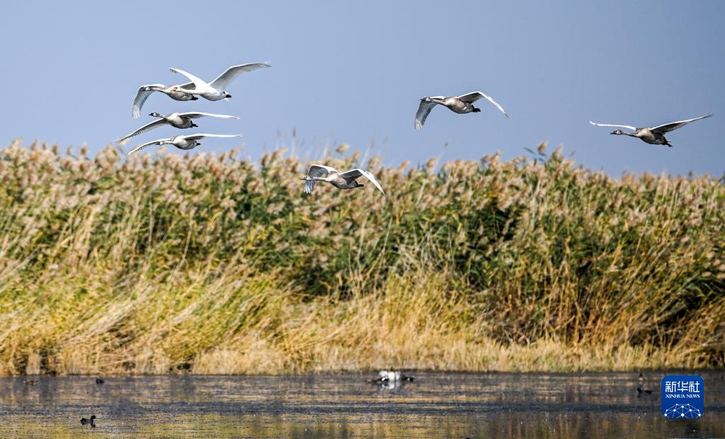 烏梁素海,意為“紅柳湖”,位于黃河“幾字彎”頂部,是黃河流域最大的湖泊濕地。近年來(lái),隨著(zhù)烏梁素海生態(tài)治理力度不斷加大,生態(tài)成果也不斷顯現。各類(lèi)候鳥(niǎo)在這里安了家,本來(lái)前往西伯利亞的疣鼻天鵝也在烏梁素海產(chǎn)卵孵化生活,烏梁素海成為我國最大的疣鼻天鵝繁殖基地。近日,在烏梁素海湖面上,成年疣鼻天鵝帶領(lǐng)幼鳥(niǎo)練習飛翔,準備為過(guò)冬前的長(cháng)途遷徙做準備。