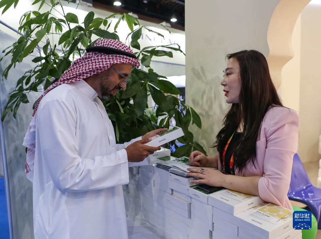 9月25日,參展商(右)在2023遼寧國際美麗健康產(chǎn)業(yè)博覽會(huì )上介紹產(chǎn)品。